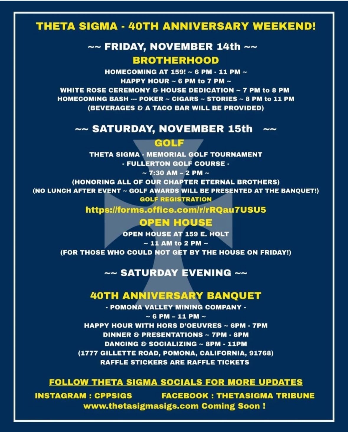 On Saturday, November 15th, the celebration continues with the Theta Sigma Memorial Golf Tournament at Fullerton Golf Course from 7:30 AM to 2 PM. This event honors our Chapter Eternal Brothers. There will be no lunch at the golf tournament. Golf awards will be presented at the Saturday night banquet.